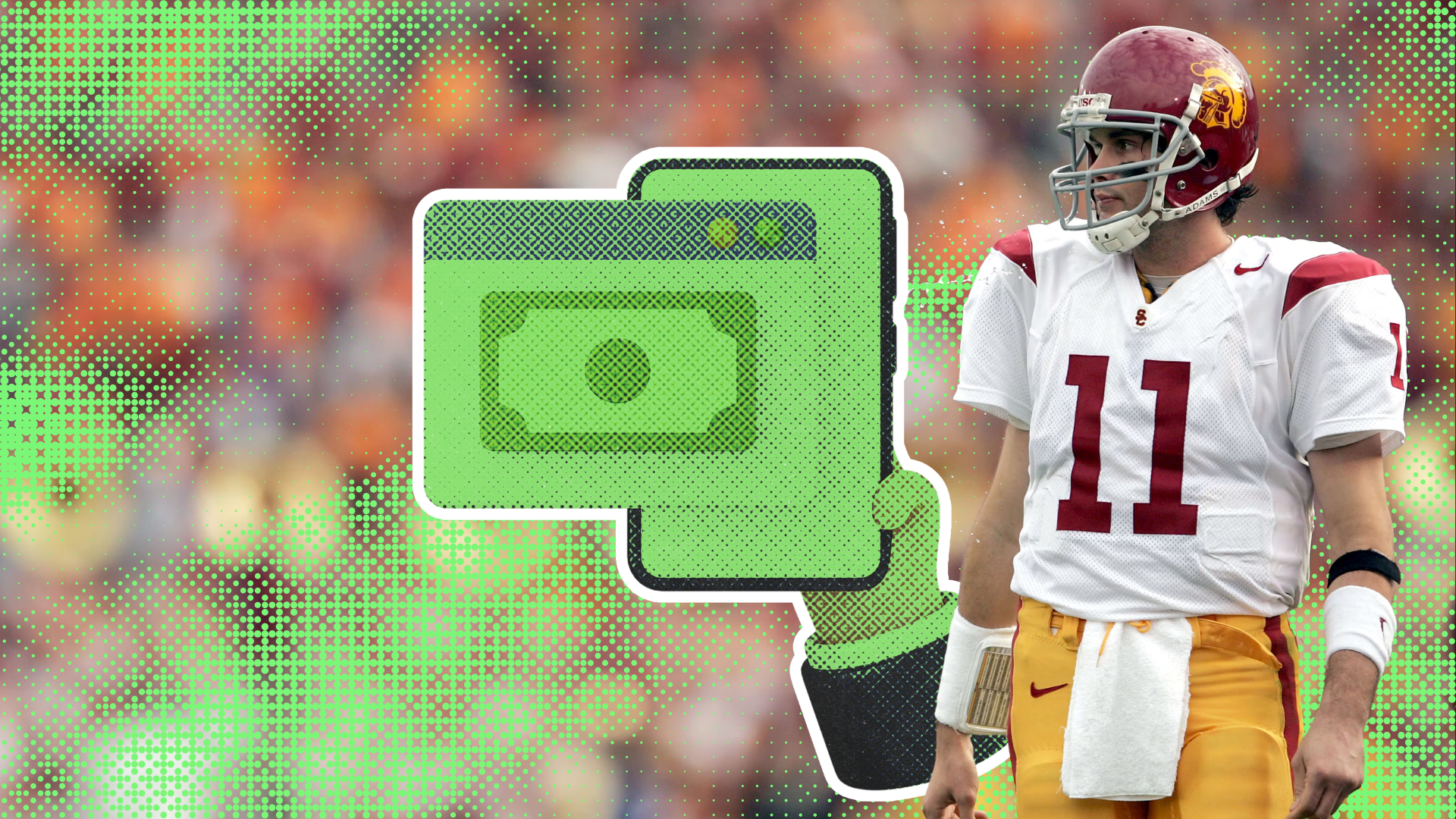 Football player in red Texas Tech Raiders uniform facing left and football player in white Texas Longhorns uniform with helmet numbered 16 and named Manning facing away.