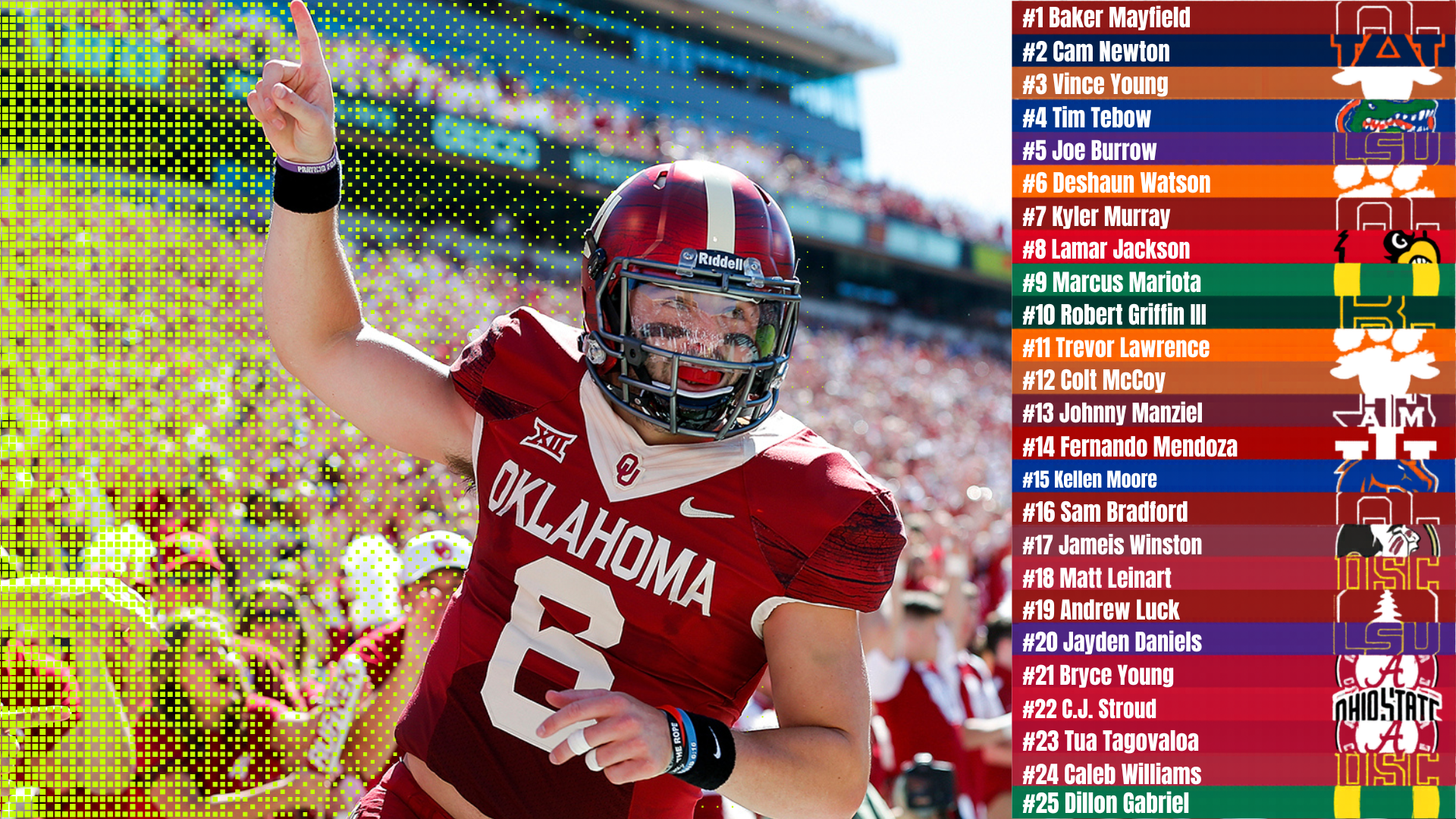 And he's right. What makes Mayfield's placement at No. 1 so defensible — and so maddening for everyone else's fan base — is that it's not based on one shining moment. It's the whole arc. It began with him walking on at Texas Tech, quickly winning the starting job and throwing for 413 yards in his debut. He lost his job to injury, then transferred to Oklahoma, where the Sooners hadn't won an outright conference title since 2010 — and he led them to three in a row, with three top-five finishes and two CFP bids.